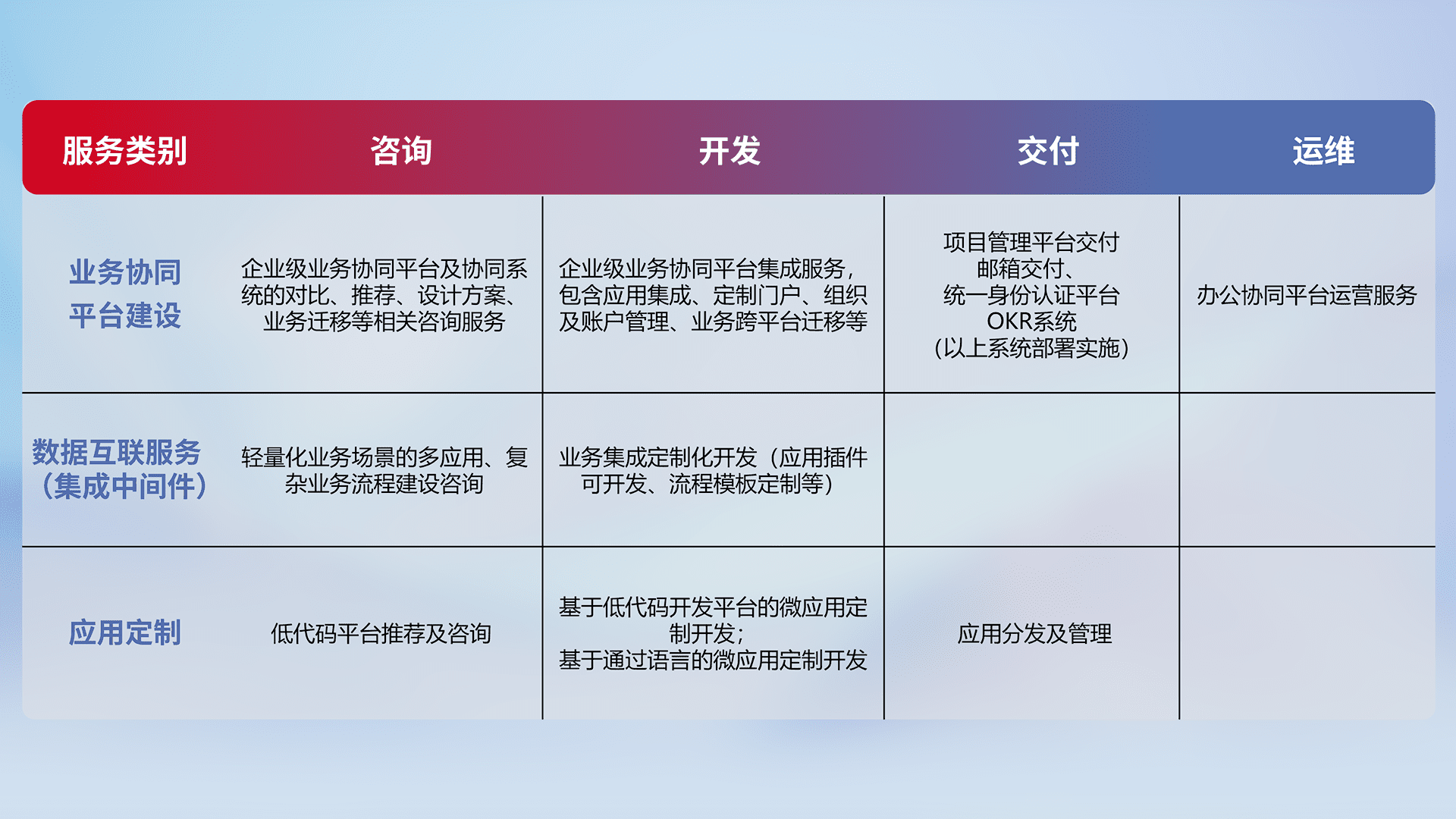 针对钉钉、、、企微、、、、IDaas等平台级产品提供产品的规划、、方案、、、交付、、定制化开发等服务,,,实现如统一协同办公、、、智能客户服务、、、、混合会议管理、、、智能数据查询、、、等业务场景,,实现数字化转型。。