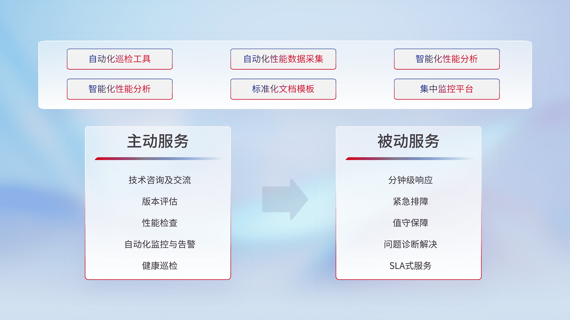 智能化工具和标准化文档,,,保障服务质量,,提供主动服务(包含技术咨询、、、版本评估、、、性能检查、、自动化监控与告警、、、健康巡检)和被动服务包含(分钟级响应、、紧急排障、、值守保障、、问题诊断解决、、、、SLA服务)。。。